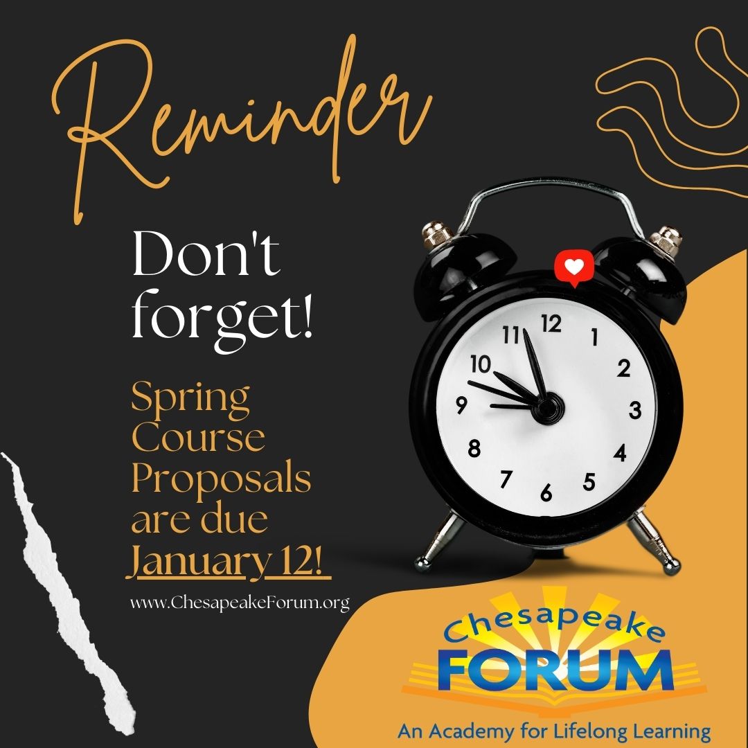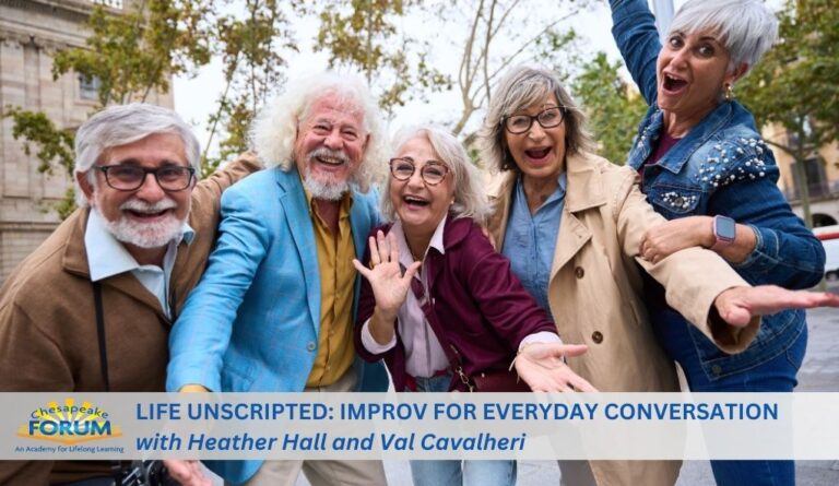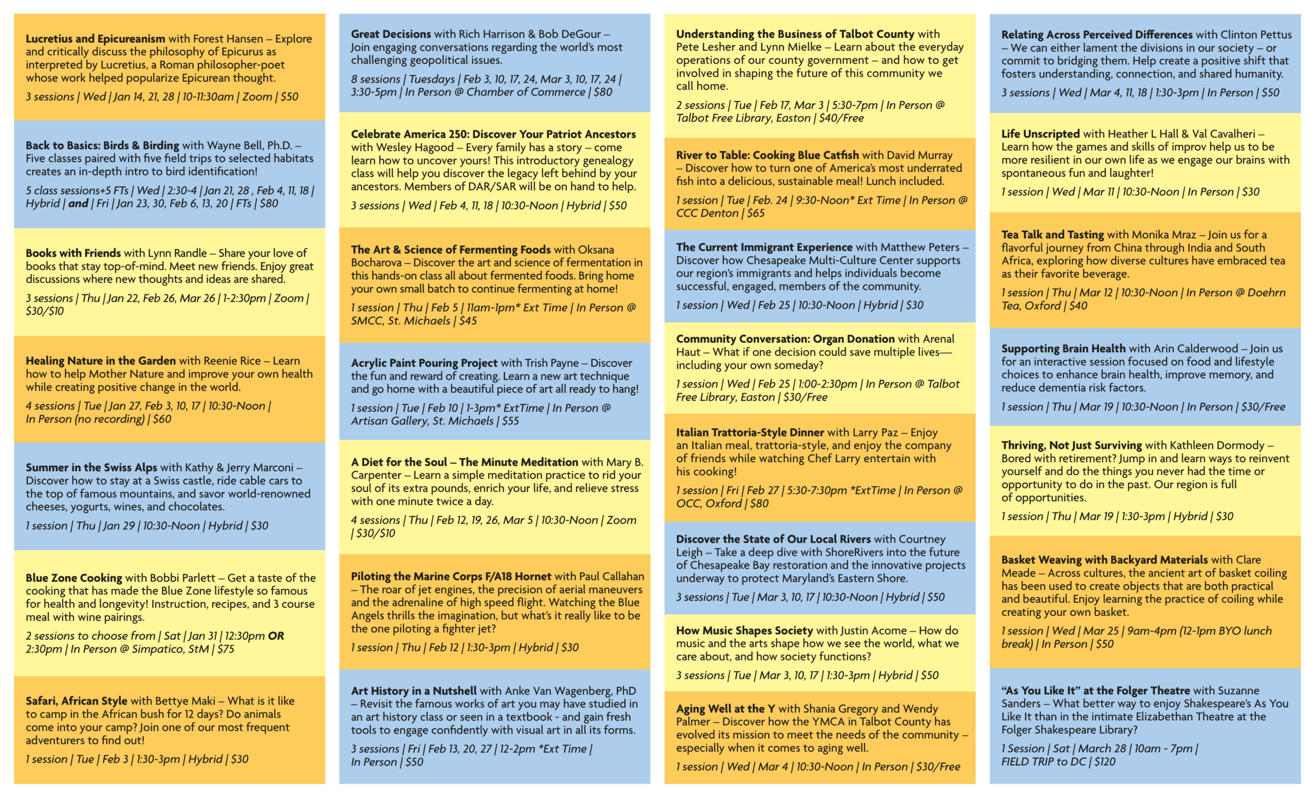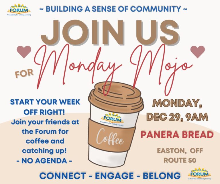 In case of inclement weather, Chesapeake Forum follows the Talbot County Public School closing procedures. Refer to the TCPS website, or you may find school closing information on your local radio and television stations. Weather cancellations of in-person courses will be rescheduled for a later date. If a HYBRID course is impacted by weather, instead of meeting at our classroom at the Easton Family YMCA, the course will proceed on ZOOM.